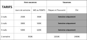 Voici les tarifs de réservation. N’hésitez-pas à nous contacter, si vous êtes intéressés… via le formulaire de contact